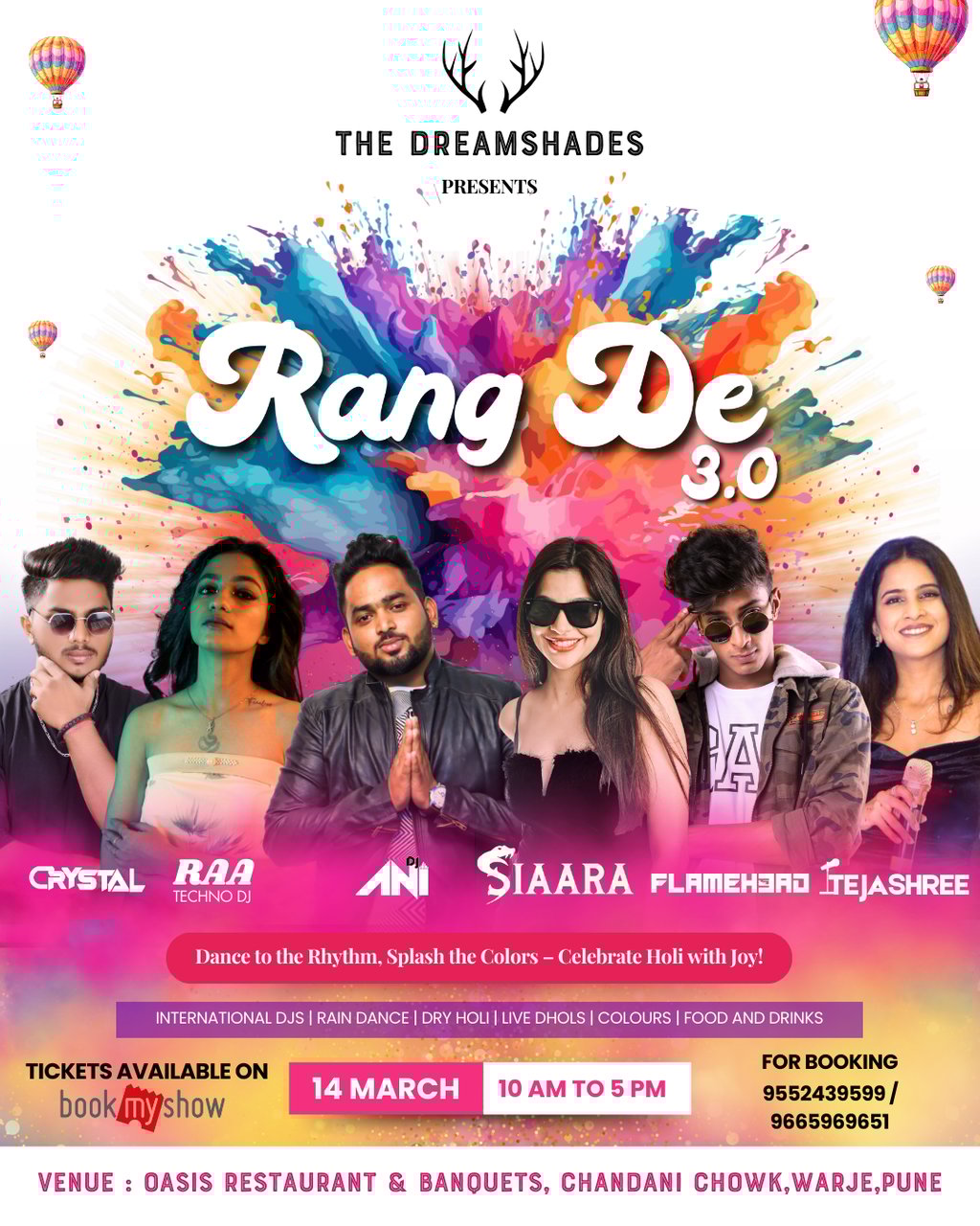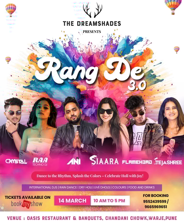 Are you ready to immerse yourself in vibrant colors, joyous laughter, and an unforgettable experience? We invite you to join us for an exciting Holi celebration, Rang De 3.0, in association with The Dreamshade ! This event promises to be one of the highlights of your calendar, and it's happening at the fabulous Oasis Club, conveniently located near Warje and Chandani Chowk in Pune.